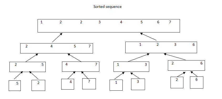 ابتدا این آرایه را نصف میکنیم پس دو آرایه به طول ۴ بهدست میآید، که برابر است با (۵،۲،۴،۷) و(۱،۳،۲،۶) سپس این روال را تا جایی ادامه میدهیم که که طول آرایههایمان برابر یک شود؛ که برابر است با: (۶)(۲)(۳)(۱)(۷)(۴)(۲)(۵) حال به صورت زیر آنها را با هم ادغام میکنیم تا به آرایه اصلیمان برسیم.