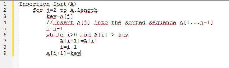 شبه کد مربوط به مرتب سازی درجی به صورت زیر است که در آن اعداد ورودی به صورت درجا مرتب می‌شوند یعنی اعداد در داخل آرایه دوباره چیده می‌شوند و ورودی الگوریتم آرایه‌ی A می‌باشد و پس از اجرای الگوریتم آرایه‌ی ورودی A شامل خروجی است :