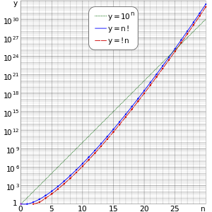 یک نکته: اگر چنانچه مفهوم حد در بینهایت و بسط تیلور $e^x$ ($e$ همان عدد نپر است که حدود $2.71$ میباشد) را بدانید، با بردن $n$ به سمت $\infty$ و قرار دادن $x=-1$، $D_n$ به $\frac{n!}{e}$ میل میکند و این نتیجه میدهد اگر $n$ به حد کافی زیاد باشد (از حدود $n=10$ به بعد این را خواهید دید)، از حدود هر ۳ جایگشت تصادفی، انتظار میرود حدود یکی از آنها پریش باشد! در شکل زیر میتوانید رشد تعداد پریشها را با رشد تعداد کل جایگشتها، با بالا رفتن $n$، مقایسه کنید: