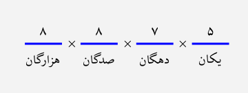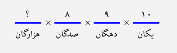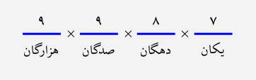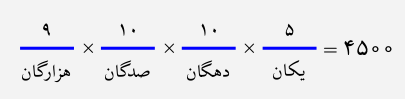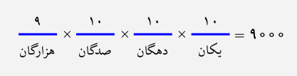 برای هر رقم، یک جایگاه، مانند شکل زیر، در نظر میگیریم و تعداد حالات آن رقم را مینویسیم. رقم هزارگان، ۹ حالت دارد (۰ نمیتواند باشد) و هر کدام از ارقام یکان، دهگان و صدگان، ۱۰ حالت دارند؛ بنابراین $9\times10\times 10\times10=9000$ عدد ۳ رقمی داریم.