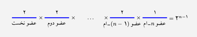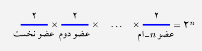 از اصل ضرب استفاده میکنیم. هر عضو از مجموعه ۲ حالت دارد (یا در زیرمجموعه میآید یا در زیرمجموعه نمیآید). پس تعداد زیرمجموعههای یک مجموعهی $n$-عضوی،