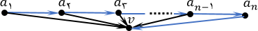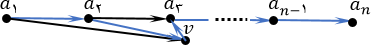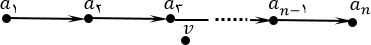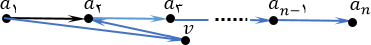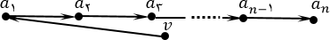 گام: فرض کنید مجموعه راسهای تورنمنت ما $\{a_1,a_2,\dots,a_{n-1},v\}$ است. که برای زیر گرافی با رئوس $a_1$ تا $a_{n-1}$ مسیر همیلتونی وجود دارد. که میتوان فرض کرد این مسیر از $a_1$ به ترتیب شروع شده تا $a_{n-1}$ ادامه دارد. مانند تصویر