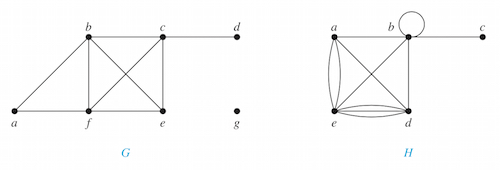 مثال: درجه ی هر یک از رئوس گراف های زیر را بیابید. $$In \quad G : deg(a) = 2, deg(b) = 4, deg(c) = 4, deg(d) = 1, deg(e) = 3, deg(f) = 4, deg(g) = 0$$ $$In \quad H : deg(a) = 4, deg(b) = 4+2* = 6, deg(c) = 1, deg(d) = 5, deg(e) = 6$$ *سهم حلقه در درجه ی رئوس ۲ می باشد.