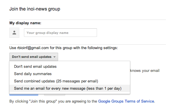 بعد از ورود یک نام دلخواه در کادر My display name (مثلا این نام میتواند اسم واقعی خودتان باشد) میباید گزینهی پایین آن را از Don’t send email updates به Send me an email for every new message تغییر دهید. اگر این کار را انجام ندهید ایمیلی از طرف گروه دریافت نخواهید کرد و فقط با مراجعه به گروه میتوانید از اخبار گروه مطلع شوید.