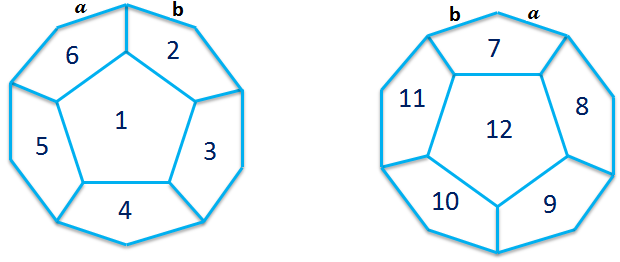 توجه کنید که این دو نصفهی شکل به هم چسبیدهاند، طوری که وجههای همسایهی ۷ وجوه ۲، ۱۱، ۱۲، ۸ و ۶ هستند و در واقع دو نصفه از روی یالهای $a$ و $b$ بههم چسبیدهاند.
