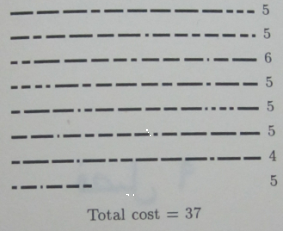 $k$ کلمهی $w_1$، $w_2$، … و $w_k$ داده شدهاند. طول کلمهی $w_i$، $l_i$ است. میخواهیم این $k$ کلمه را به عنوان یک پاراگراف به بهترین صورت ممکن حروفچینی کنیم به طوری که طول کلیهی سطرهای این پارگراف (به غیر از احتمالا سطر آخر) باشد. بین کلمات حروفچینی شده در یک سطر، فاصلهی خالی وجود خواهد داشت. اندازهی واقعی هر فاصلهی خالی $b$ واحد است و این بهتین فاصلهی خالی است، اما در صورت لزوم اندازهی فواصل خالی بین کلمات را میتوانیم بزرگتر و یا کوچکتر کنیم.