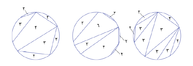 در یک قفس دایره شکل به شعاع $R$، $n$ خرس خوابیدهاند. رئیس باغوحش قصد دارد یک سری دیوار در این قفس بسازد تا خرسها به دستههای حداکثر $k$ تایی دسته بندی شوند. زیرا اگر در هنگام بیدار شدن آنها، بیش از $k$ تا خرس در یک اتاق باشند، با هم دعوا می کنند. دورتادور قفس دقیقاً $360$ تا میله با فواصل مساوی چیده شده است . میلهی صفرم روی نقطهی $(R,0)$ و مرکز قفس هم در $(0,0)$ میباشد. شمارهی میلهها از $0$ تا $359$ است و درجهت پادساعت گرد افزایش می یابد. به عبارت دیگر میلهی $i$ام در امتداد $i$ درجه از مرکز (نسبت به میله ی صفرم) قرار دارد. تمام دیوارها باید بین دو میله به صورت خطی مستقیم کشیده شوند و تضمین شده که نمیتوان دیواری کشید که از روی یک خرس عبور کند (هیچ خرسی روی خط واصل بین دو میله قرار ندارد). از طرفی دیوارها نباید در هیچ نقطهای به جز در نقاط انتهایی اشتراک داشته باشند و نباید یکدیگر را قطع کنند. رئیس باغوحش یک شرط دیگر هم میگذارد و آن این است که هیچ یک از اتاقهای پدید آمده، بیش از سه گوشه نداشته باشد (چه خرسی در آن اتاق باشد و چه نباشد). برای نمونه به شکلهای زیر توجه کنید: