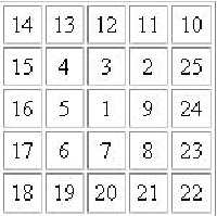 یک عدد $n$ از ورودی بخواند. (فرض کنید آرایهی $a$، اندازهاش $(2n+1)\times(2n+1)$ است.) سپس اعداد $1,2,\ldots,(2n+1)^2$ را مطابق شکل زیر در آن قرار دهد، بهطوریکه ۱ در وسط قرار بگیرد. در لایهی بعدی مربع (از وسط) با شروع از گوشه بالاراست و در جهت عکس حرکت عقربههای ساعت اعداد بعدی (۲ تا ۹) قرار بگیرد. در لایهی بعدی بههمان ترتیب، اعداد بعدی و غیره.