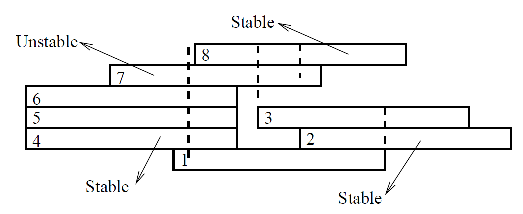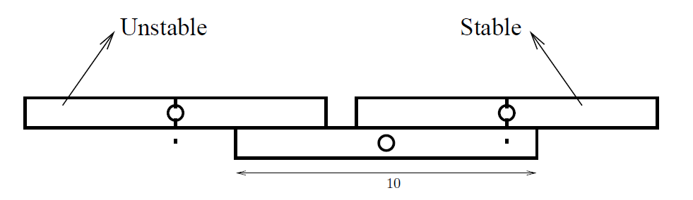 هر کتاب یک مکعب مستطیل با طول ۱۰ و عرض یک است. او کتابها را طوری روی هم میچیند که به جز پایینترین کتاب، بقیه کتابها روی دقیقاً یکی دیگر از کتابها قرار بگیرد. او در ذهنش یک چینش از کتابهایش در نظر دارد و میخواهد قبل از اینکه آن را بسازد، مطمئن شود که چینش مورد نظرش پایدار است. او بعد از کلی تحقیق فهمید که برای فهمیدن پایداری، نیاز به مفهوم مرکز ثقل دارد. مرکز ثقل یک مجموعه از کتابها یک عدد است که برابر میانگین مختصهی $x$ ِ وسط همهی آنها است. (مرکز ثقل یک کتاب مختصهی $x$ ِ وسط آن است)