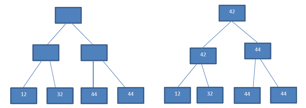 یک درخت دودویی با $n$ برگ داریم. روی هر یک از برگها یک رشته به طول $m$ با حروف $\{1,2,3,4\}$ نوشته شده است. ما میخواهیم روی راسهای درونی درخت رشتههای به طول $m$ بنویسیم به طوری که مجموع کل فاصلههای رشته هر راس با رشته پدرش کمینه شود. در حالت کلی یک الگوریتم از $Ο(mn)$ ارائه دهید که با گرفتن رشتههای مربوط به برگها و ساختار درخت رشتههای بهینه برای رؤوس درونی درخت را بدست آورد. دقت کنید درخت دودویی درختی است که هر راس آن یا برگ است یا دو فرزند دارد. بعنوان نمونه در شکل زیر یک درخت و جواب آن آمده است. در این درخت $6$ یال وجود دارد که هزینه سه یال $1$ و هزینه بقیه یالها صفر می باشد.