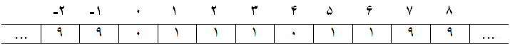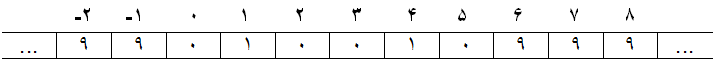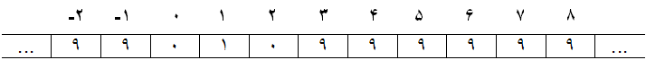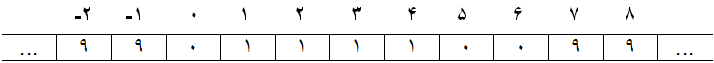 ب) فرض کنید در ابتدا در خانههای 0 تا $k$حافظه دنبالهای از رقمهای 0 و ۱ و در بقیهی خانههای حافظه ۹ ذخیره شده باشد. برنامهای برای این ماشین بنویسید که پس از انجام عملیات ماشین و متوقف شدن آن، در خانههای 0 تا $k$ و نیز در خانههای $k+1$ تا $2k+1$ همان رشتهی اولیه نوشته شده باشد. به عبارت دیگر برنامهی شما باید دنبالهی نوشته شده در خانههای 0 تا $k$ رادر خانههای $k+1$ تا $2k+1$ کپی کند. برای مثال، اگر وضعیت اولیه نوار به صورت زیر باشد: