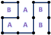 در یک شبکهی $m\times n$ یک مسیر فراگیر از گوشهی سمت چپ و بالا به گوشهی سمت راست و پایین رسم کردهایم. در خانههایی که به اضلاع بالا و راست راه دارند $A$ و در خانههایی که به اضلاع چپ و پایین راه دارند $B$ مینویسیم. ثابت کنید تعداد $A$ ها و $B$ ها برابر است.