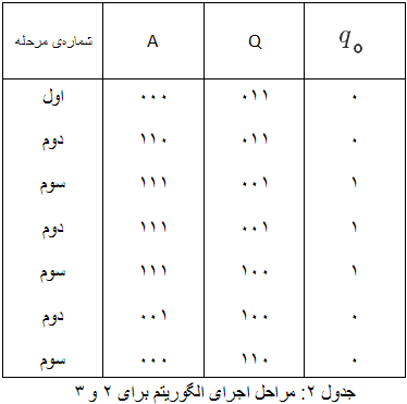 برای مثال جدول ۲ روند اجرای الگوریتم برای ضرب دو عدد ۰۱۰ و ۰۱۱ نشان میدهد.
