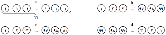 $99$ ظرف با تعدادی گردو در هریک موجود است، این ظرفهاروی یک میز به صورت یک صف قرار گرفتهاند. هرجا میتوانیم ۲ ظرف کنار هم را انتخاب میکنیم و از هر کدام ۱ گردو برداریم (هر دو باید حداقل ۱ گردو داشته باشند)،یا به هر کدام ۱ گردو اضافه میکنیم. دو وضعیت از ظرفها را قابل تبدیل به هم مینامیم اگر بتوان با شروع از هر کدام و با چند بار انجام این دو حرکت٬ به دیگری رسید. چند زوج متمایز از چهار وضعیت $a$، $b$، $c$ و $d$ به هم قابل تبدیلاند؟