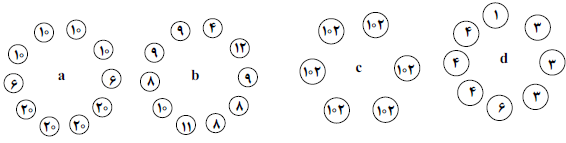 اگر مسأله‌ی قبل این‌گونه تغییر کند که ظرف‌ها دور یک میز دایره شکل قرار گرفته‌اند و در هر مرحله فقط می‌توانیم به ‎۴‎ ظرف متوالی هر کدام ‎۱‎ گردو اضافه کنیم، از وضعیتی که همه‌ی ظرف‌ها خالی هستند به کدام‌یک از وضعیت‌های زیر می‌توان رسید؟‎