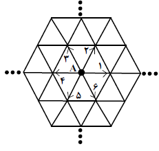 در شکل مقابل یک نفر روی نقطهی $A$ ایستاده است. او در هر حرکت تاس میاندازد و با توجه به شمارهی تاس، یک واحد در جهت مربوطه (که در شکل مشخص شده) جلو میرود. حال پس از انداختن ۴ تاس به چه احتمالی به نقطهی اول باز میگردد(توجه کنید کههمهی صفحه مثلثبندی شدهاست)؟