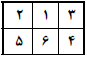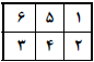 خانه‌های یک جدول ‎$2\times 3$‎، با شش رنگ که با اعداد ‎۱‎ تا ‎۶‎ شماره‌گذاری شده‌اند، رنگ شده‌اند. کاغذ را ‎۳‎ بار تا می‌زنیم تا در نهایت به یک مربع ‎$1\times 1$‎ برسیم، توجه کنید که تا زدن فقط روی خطوط افقی و عمودی جدول مجاز است. حال شش مربع ‎$1\times 1$‎ به ترتیبی روی هم قرار گرفته‌اند. کدام‌یک از رنگ‌آمیزی‌های زیر را نمی‌توان ‎۳‎ بار تا زد به نحوی که رنگ‌ها به ترتیب ‎۱‎ تا ‎۶‎ روی هم قرار گرفته باشند؟