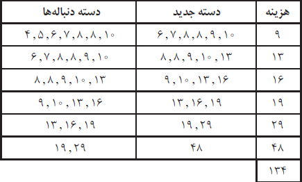ترکیب دو دنباله‌ی مرتب $A$ و $B$ به ترتیب با اندازه‌های $n$ و $m$ یک دنباله‌ی مرتب به‌ اندازه‌ی $n+m$ تولید می‌کند و این کار به‌ اندازه‌ی $m+n$ هزینه دارد. (مثلاً اگر $A=(1,2,3,5)$ و $B=(4,6)$ باشد $C=(1,2,3,4,5,6)$ ترکیب این دو دنباله و هزینه‌ی تولید آن ۶ است). برای ترکیب سه دنباله، ابتدا دو تای آن‌ها را باهم ترکیب و دنباله‌ی حاصل را با دنباله‌ی سوم ترکیب می‌کنیم. بدیهی است که انتخاب دو دنباله‌ی اول در کل هزینه‌ی ترکیب مؤثر است. حال فرض کنید ۷ دنباله به‌اندازه‌های ۴، ۵، ۶، ۷، ۸، ۸، و ۱۰ داریم. کم‌ترین هزینه‌ی کل برای ترکیب این ۷ دنباله چه قدر است؟