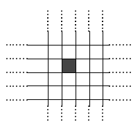 یک جدول ۲ بعدی نامتناهی را در نظر بگیرید که در ابتدا تمام خانههای آن سفید است. در مرحلهی اول یکی از خانههای آن را بهدلخواه سیاه میکنیم (شکل مقابل). از مرحله دوم به بعد، در هر مرحله کلیهی خانههایی که ۱، ۲ و ۳ همسایه سیاه دارند را مشخص میکنیم و سپس همهی آنها را سیاه و بقیهی خانهها را سفید میکنیم. (دو خانه مجاورند اگر ضلع مشترکی داشته باشد).