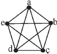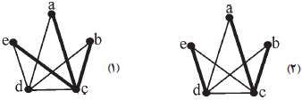 2. اگر ضلعی مانند $cd$ از پنج ضلعی کم‌رنگ باشد آن‌گاه دقیقا یکی از دو ضلع $ec$ و $ed$ کم‌رنگ خواهند بود. اگر سه ضلع کم‌رنگ همگی متصل به یک ر‌اس(مانند $d$) متصل باشند و یا دو تا از آن‌ها به یک راس و سومی به راس دیگر وصل باشند به ترتیب به دو شکل «۱» و «۲» خواهیم رسید: