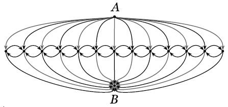 یک مسیر، دنبالهای از جادههایی متوالی است که از شهر $A$ شروعشده و به شهر $B$ برسد و هر شهر، حداکثر یکبار در آن ظاهر شود. طول یک مسیر برابر تعداد جادههایی است که در آن مسیر قرار دارند. تعداد مسیرهای به طول فرد منهای تعداد مسیرهای به طول زوج برابر است با: