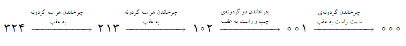آقای «ب» بهتازگی یک کیف سامسونت خریده است که رمز آن از سه گردونهی ارقام تشکیل شده است که اعداد ۰ تا ۹ به ترتیب روی هرکدام از آنها نوشتهشدهاند. آقای «ب» در هر حرکت میتواند یک، دو یا سه گردونه را همزمان یک واحد به جلو یا عقب بچرخاند؛ در این صورت اعداد روی گردونههای چرخانده شده به ترتیب یک واحد زیاد یا یک واحد کم میشوند. دقت کنید که اگر گردونهای مقدار ۹ را داشته باشد و یک واحد به جلو چرخانده شود، مقدار آن صفر شده و نیز اگر گردونهای مقدار صفر را داشته باشد و یک واحد به عقب چرخانده شود، مقدار آن ۹ میشود. برای مثال، آقای «ب» میتواند مطابق شکل زیر، رمز کیفش را در ۴ حرکت از ۳۲۴ به صفر تبدیل کند: