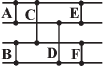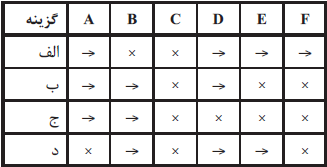 اگر سوئیچ‌ها را مطابق شکل مقابل با $E$ ، $D$ ، $C$ ، $B$ ،$A$ و $F$ نام‌گذاری کنیم٬ آن‌گاه اگر وضعیت آن‌ها را به ترتیب مطابق جدول زیر در نظر بگیریم٬ آن‌گاه به هر یک از خروجی‌های موجود در گزینه‌ها خواهیم رسید(علامت $\times$ نشان‌گر ضربدری بودن سوئیچ و علامت $\rightarrow$ نشان‌گر مستقیم بودن سوئیچ می‌باشد):