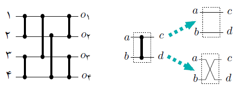مدار زیر با ۴ ورودی و ۶ «سویچ» را در نظر بگیرید. هر سویچ می‌تواند مستقل از بقیه‌‌ی سویچ‌ها در دو حالت «مستقیم» یا «ضربدری» قرارگیرد. چنان چه در شکل نشان داده‌ شده است، اگر سویچ در حالت مستقیم باشد دو سر ورودی‌اش را مستقیماً به دو سر خروجی‌اش وصل می‌کند. در حالت ضربدری، سویچ این کار را به‌صورت ضربدری انجام می‌دهد.