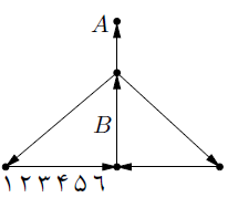 شکل روبهرو نشاندهندهی تعدادی خیابان و تقاطعهای بین آنهاست. خیابانها در جهت فلشها یکطرفه هستند. عرض هر خیابان هم بهاندازه یک ماشین است؛ یعنی ماشینها نمیتوانند از یکدیگر سبقت بگیرند. همچنین ماشینها نمیتوانند در محل تقاطعها بایستند. درنتیجه در هرلحظه هر ماشین فقط میتواند در یک خیابان قرار بگیرد. میدانیم که یک ایستگاه عوارضی در خیابان $B$ قرار دارد و از هر ماشین که عبور میکند مبلغ ۱۰ تومان دریافت میکند. نقطهی $A$ که در شکل دیده میشود یک پارکینگ است. ماشینهای با شمارهی ۱ تا ۶ پشت سر هم قرار دارند. میخواهیم این ماشینها را به پارکینگ $A$ منتقل کنیم. کمترین مجموع مقدار عوارض پرداختی چه قدر است تا این ماشینها به ترتیب شمارههایشان (اول ۱ بعد ۲، …) وارد پارکینگ شوند؟