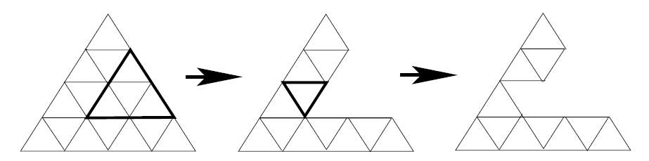 بدیهی است درصورتی که شکل باقیمانده یک مثلث متساویالاضلاع باشد میتوان در یک مرحله همهی آن را دور ریخت. در شکل زیر یک مثال تا دو مرحله نشان داده شده است.