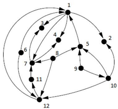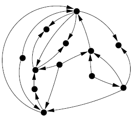 هر سال، نهنگی که متوجه شود یکی از نهنگ‌هایی که او دوست داشته، سال گذشته مرده، خودکشی می‌کند. شکل روبه‌رو یک جامعه از نهنگ‌ها را نشان می‌دهد. اگر نهنگ $A$ به $B$ پیکان داشته باشد، یعنی $A$٬ $B$ را دوست دارد. حدّاقل چند پیکان جدید باید رسم کنیم تا نهنگی وجود داشته باشد که با کشتن آن، همه‌ی نهنگ‌ها از بین بروند؟