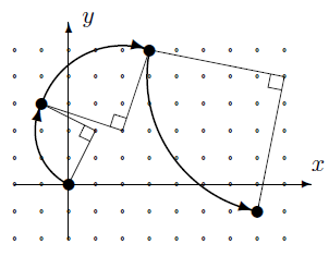 یک میمون در نقطه‌ی (۰٫۰) صفحه‌ی مختصات قرار دارد. این میمون در هر حرکت می‌تواند نقطه‌ای با مختصات صحیح را انتخاب کند که از نقطه‌ی فعلی‌اش، فاصله‌ای بیشتر از ۱۰ واحد نداشته باشد. سپس، حول آن ۹۰ درجه دوران یافته و در نقطه‌ی جدید قرار بگیرد. نمونه‌ای از حرکت های میمون را در شکل مشاهده می‌کنید. این میمون به چند تا از نقطه‌های زیر می‌تواند برسد؟
