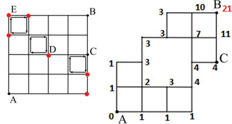 پلیس درصدد دستگیر کردن یک مجرم فراری است. این مجرم تحت تعقیب در نقطهی $A$ در شکل روبهرو قرار دارد و میخواهد در ۸ دقیقه به نقطهی $B$ برود. او میتواند در هر دقیقه روی یک ضلع یک خانهی جدول حرکت کند. در لحظهای که مجرم در نقطهی $A$ قرار دارد٬ ۳ پلیس در نقاط $C$ و $D$ و $E$ هستند٬ و هرکدام٬ در یک مسیر دوری که در شکل با چهار پیکان نشان داده شده حرکت میکنند. جهت حرکت نیز مشخص شده است. پلیسها نیز در هر دقیقه یک ضلع یک خانهی جدول را طی میکنند. اگر مجرم و یکی از پلیسها در یک نقطهی تقاطع در جدول قرار بگیرند٬ پلیس مجرم را دستگیر میکند٬ ولی اگر روی یک ضلع یک خانهي جدول از روبهروی هم بگذرند پلیس نمیتواند او را دستگیر کند. پلیس میخواهد بداند چند مسیر مختلف برای مجرم از نقطهی $A$ به نقطهی $B$ وجود دارد که اگر مجرم آن مسیرها را انتخاب کند٬ پلیس نمیتواند او را دستگیر کند.