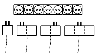۷ پریز برق با ابعاد $۱\times۱$ در یک ردیف٬ مطابق شکل روی دیوار نصب شده‌اند. ۴ وسیله‌‌ی برقی در اختیار داریم که می‌خواهیم از آن‌ها به صورت هم‌زمان استفاده کنیم. دوشاخه‌های این وسیله‌ها مانند شکل با اندازه‌های $۱\times۳$٬ $۱\times۲$ ٬$۱\times۲$ و $۱\times۱$ هستند. به چند طریق می‌توان این دوشاخه‌ها را در پریزها قرار داد٬ به طوری که تمام وسیله‌ها روشن شوند؟ دقت کنید که مجاز به چرخاندن دوشاخه‌ها نیستیم.