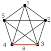 ابتدا کش $a$ که رسم نشدهاست را اضافه میکنیم و در نهایت تعداد حالتهایی که شامل کش $a$ هستند را از جواب کم میکنیم (متمم گیری). هر میخ باید به ۲ کش متصل باشد. برای انتخاب یکی از کشهای میخ ۱، ۴ حالت داریم. فرض کنیم سر دیگر کش، میخ $i$ باشد. از بین کشهایی که به $i$ وصلاند یکی انتخاب شده پس ۳ انتخاب وجود دارد و برای میخهای دیگر به همین ترتیب ۲ و ۱ انتخاب داریم. ترتیب انتخاب کشها اهمیتی ندارد پس کل حالتها را تقسیم بر ۲ میکنیم. بنابراین $\frac{4×3×2×1}{2}=12$ حالت برای انتخاب کشها وجود دارد.