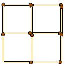 شکل زیر از ۱۲ چوبکبریت تشکیل شده است. به چند طریق میتوان ۸ تا از این چوبکبریتها را برداشت٬ به طوری که هیچ دو چوبکبریتی از چهارتای باقیمانده به هم وصل نباشند (در هیچ نقطهای اشتراک نداشته باشند)؟