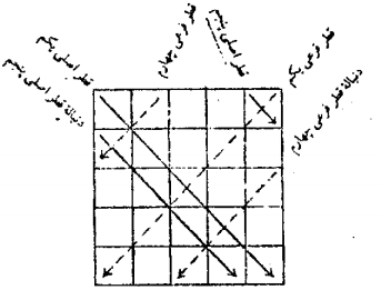 ج) الگوریتمی بنویسید که حاصل ضرب قطری $A\times B$ را به دست آورده& در یک ماتریس $N\times N$ دیگر، $C$، قرار دهد. ضرب قطری دو ماتریس، $A\times B$، شبیه ضرب معمولی آن دو میباشد. با این تفاوت که به جای ضرب شدن سطر $i$ ام ماتریس اول در ستون $j$ ام ماتریس دوم، قطر اصلی $i$ ام ماتریس اول در قطر فرعی $j$ ام ماتریس دوم ضرب میشود. برای مثال قطرهای اصلی و فرعی یک ماتریس $5\times 5$ در شکل زیر نشان داده شده است: