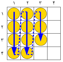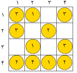 یک جدول $۱۶\times ۱۶$ را در نظر بگیرید که سطرها و ستونهای آن به ترتیب شمارههای ۱ تا ۱۶ گرفتهاند. هر خانه میتواند خالی باشد یا درون آن یک سکه قرار گرفته باشد. روی هر سکه یک شماره بین ۱ تا ۱۶ نوشته شده است٬ اما از هر شماره حداکثر ۱۶ سکه در جدول وجود دارد. در شکل روبهرو مثالی از یک جدول $۴\times ۴$ با ۱۱ سکه دیده میشود. توجه کنید که برای سادگی٬ دو شکل اول برای جدول $۴\times ۴$ رسم شدهاند. اما هر سه سوال را باید براساس جدول $۱۶\times ۱۶$ پاسخ دهید.