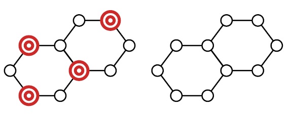 گراف شکل زیر از ۱۰ رأس و ۱۱ یال تشکیل شده است. می خواهیم روی تعدادی از رأس های این گراف خانه بسازیم به شرطی که اولا هیچ دو خانه ای مجاور نباشند (با یک یال مستقیما به هم متصل نباشند) ؛ ثانیا پس از پایان کار٬ در هیچ یک از رأس های خالی نتوان با رعایت شرط اول خانهي جدیدی ساخت.