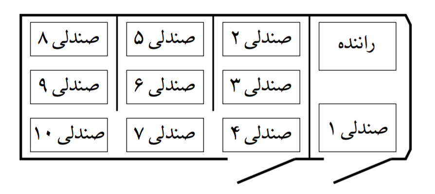 با توجه به محدودیت درها، هنگام پیاده شدن هر کس، باید صندلی‌های موجود در مسیر تا رسیدن به در خودرو، خالی باشد. برای مثال هنگام پیاده شدن مسافر صندلی ۵، اگر روی صندلی‌های ۴، ۶ و ۷ مسافری باشد، باید ابتدا این مسافرین پیاده شوند تا مسافر صندلی ۵ بتواند از خودرو خارج شود. توجه کنید خطوط سیاه پررنگ شکل، مانع هستند و مسافران نمی‌توانند از آن‌ها رد شوند. قرار است این ون در طول یک جاده‌ی مستقیم حرکت کند. ۱۰ مسافر می‌خواهند در ۱۰ جای مختلف از این جاده پیاده شوند. به چند طریق این ۱۰ نفر در ابتدای مسیر می‌توانند روی صندلی‌ها بنشینند، طوری که هنگام پیاده شدن هیچ کسی، فرد دیگری مجبور به پیاده شدن نباشد؟