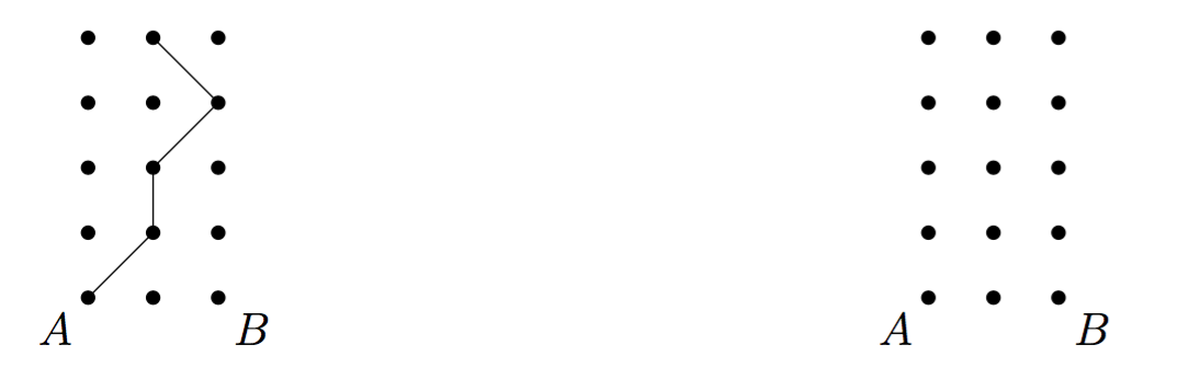 مسیری دیگر با شروع از نقطهی $B$ رسم میکند. به چند طریق این کار ممکن است، طوری که دو مسیر کشیده شده در هیچ جایی (چه روی نقاط شکل و چه جای دیگر) یکدیگر را قطع نکنند؟