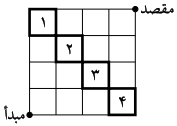 در جدول $4 \times 4$ زیر، یک دزد میخواهد از نقطهی مبدأ به نقطهی مقصد برود. دزد فقط میتواند روی پارهخطها و تنها در جهتهای بالا و راست حرکت کند. سرعت حرکت دزد، ثابت و یک واحد بر ثانیه است. به غیر از دزد، روی محیط هر کدام از چهار خانهای که با شمارههای ۱ تا ۴ نشان داده شدهاند، یک پلیس قرار دارد. پلیس هر خانه نیز با سرعت ثابت یک واحد بر ثانیه و در جهت پادساعتگرد روی محیط آن خانه حرکت میکند. اگر در یک لحظه دزد با یکی از پلیسها روی یک نقطه باشد (چه در وسط پارهخطها و چه در انتهای پارهخطها) دستگیر میشود.