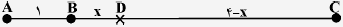 موقعیت انبار را در نقطهی $D$ در نظر میگیریم و فرض میکنیم فاصله $D$ تا $B$ برابر $x$ باشد در این صورت فاصله $D$ تا $C$ برابر با $4-x$ (اگر $D$ بین $B$ و $A$ باشد این فاصله برابر با $4+x$ خواهد بود).