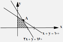 میخواهیم $30x+20y$ ماکزیمم شود٬ خط $30x+20y=k$ را چنان رسم میکنیم که از نقطهی $A$ بگذرد در این صورت حاصل $30x+20y$ ماکزیمم مقدار خود را خواهد داشت. از تلاقی دو خط $x+y=100$ و $2x+y=160$ مختصات نقطه $A$ به صورت $(60,40)$ پیدا میشود که در این حالت حاصل $30x+20y$ برابر ۲۶۰۰ میشود.
