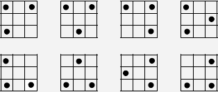 یک مهرهی شاه در صفحهی شطرنجی تمام ۸ خانهی اطراف خود را تهدید میکند. به چند طریق میتوان ۳ مهرهي غیر متمایز شاه را در یک صفحهی $3\times3$ قرار داد به قسمی که هیچ کدام همدیگر را تهدید نکنند؟