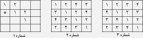 اگر خانهی * از جدول شماره ۱ را با ۳ پر کنیم آنگاه جدول به شکل جدول شماره ۲ و اگر آن خانه را با ۴ پر کنیم آنگاه آن جدول به شکل شماره ۳ پر خواهد شد.