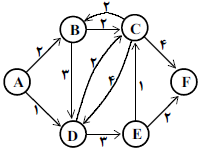 شهرهای ‎$A$‎ و ‎$B$‎ و ‎$C$‎ و ‎$D$‎ و ‎$E$‎ و ‎$F$‎ در شکل مقابل توسط خیابان‌های یک‌طرفه‌ای که هر یک را با یک پیکان نشان داده‌ایم به هم وصل شده‌اند. مقدار مصرف بنزین برای عبور از یک خیابان عددی است که روی آن خیابان نوشته شده است.