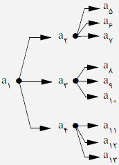 عدد $a_1$ کوچک‌ترین عدد ممکن یعنی ۱ می‌باشد. حال ۱۲ عدد باقی‌مانده را به سه دسته‌ی چهار تایی تقسیم می‌کنیم تا به شاخه‌های $a_1$ اختصاص دهیم که این کار به $\binom{12}{4} \binom{4}{8} \binom{4}{4}$ طریق ممکن است. در بین دسته‌ی اول کوچک‌ترین عدد را به $a_2$ و سه عدد دیگر را به $3!$ طریق بین $a_5$ و $a_6$ و $a_7$ تقسیم می‌کنیم. دسته‌های دیگر را نیز به همین صورت بین $a_i$ های باقی‌مانده تقسیم می‌کنیم٬ بنابراین جواب مورد نظر برابر $\binom{12}{4} \binom{4}{8} \times (3!)^3$ خواهد شد که جواب صحیح در بین گزینه‌های نیامده است.