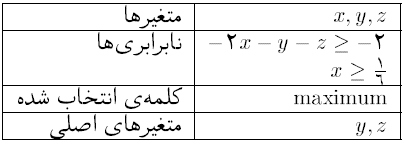اگر چنین برنامهای را به ماشین $A$ بدهیم، این ماشین به هر یک از متغیرها یک مقدار حقیقی نامنفی طوری نسبت میدهد که اولاً تمامی نابرابریها برقرار باشند و ثانیاً مجموع متغیرهای اصلی برحسب اینکه کلمهی انتخابشده minimum یا maximum بوده، کمترین یا بیشترین مقدار ممکن خود را داشته باشد. در پایان، ماشین مقادیر نسبت دادهشده به متغیرها و مجموع متغیرهای اصلی را چاپ میکند.