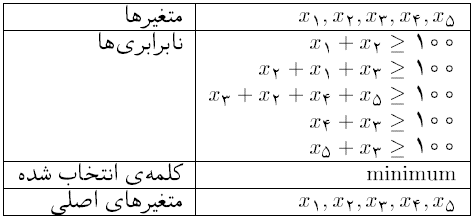 که جواب ماشین برابر ۲۰۰ است که به ازای مثلاً $x_1=100$، $x_2=0$، $x_3=100$، $x_4=0$، و $x_5= 0$ به دست میآید. مسأله ی بعدی توسط وزارت مبارزه با قاچاق پیشنهاد شد. این وزارت قصد داشت در بعضی از فرودگاههای کشور مراکز مبارزه با قاچاق تأسیس کند بهطوری که تعداد این مراکز تا حد امکان کم باشد و در حداقل یکی از فرودگاههای مبدأ یا مقصد هر پرواز یک مرکز مبارزه با قاچاق وجود داشته باشد.